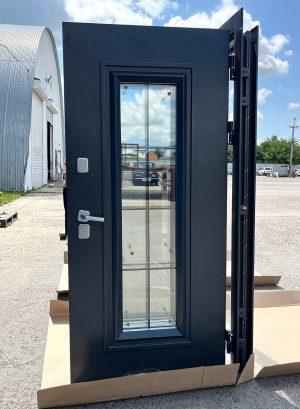 - Наружная отделка: Объемная прижимная рамка + стеклопакет двухкамерный тонированный (с ковкой решетка внутри стеклопакета) +фигурный наличник;
