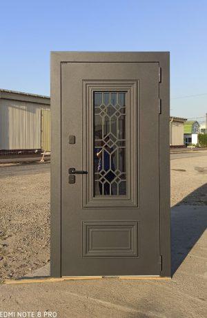 - Отделка снаружи: покрытие антикоррозийное + уличный муар 7024 (светло-серый) с наружной и внутренней стороны стеклопакет зеркальный (рефлектив серебро), вставка из нержавейки вокруг стеклопакета, давление на полотне